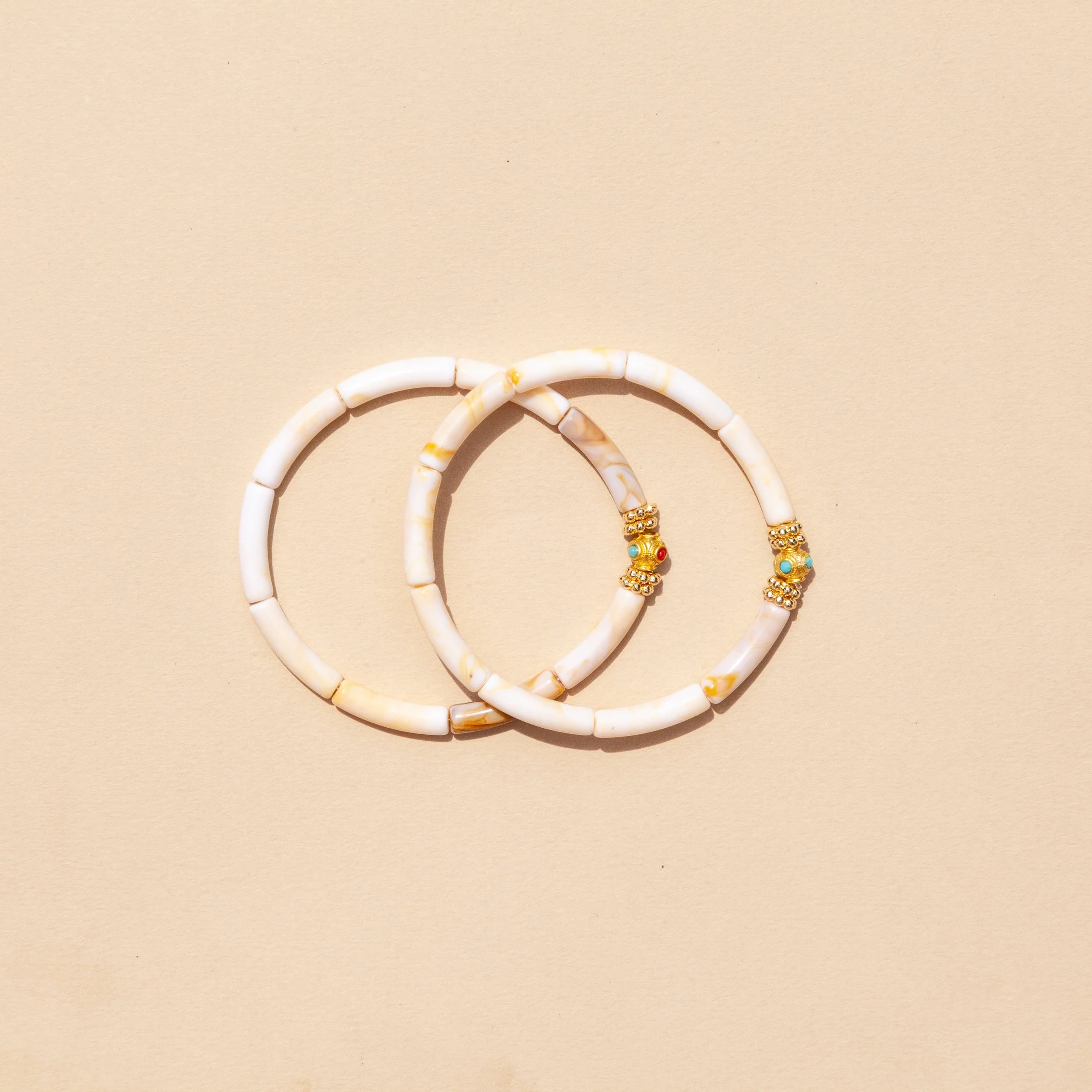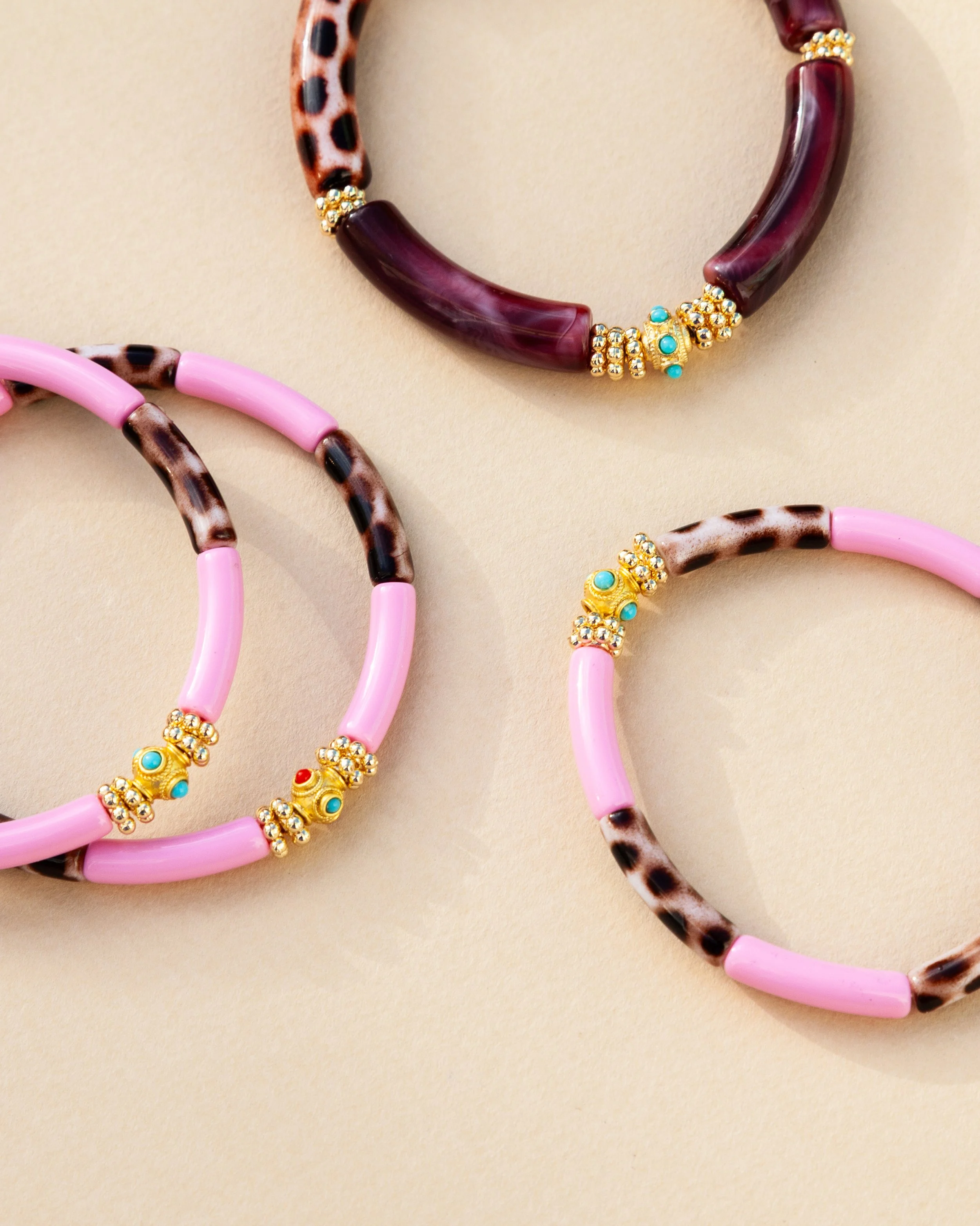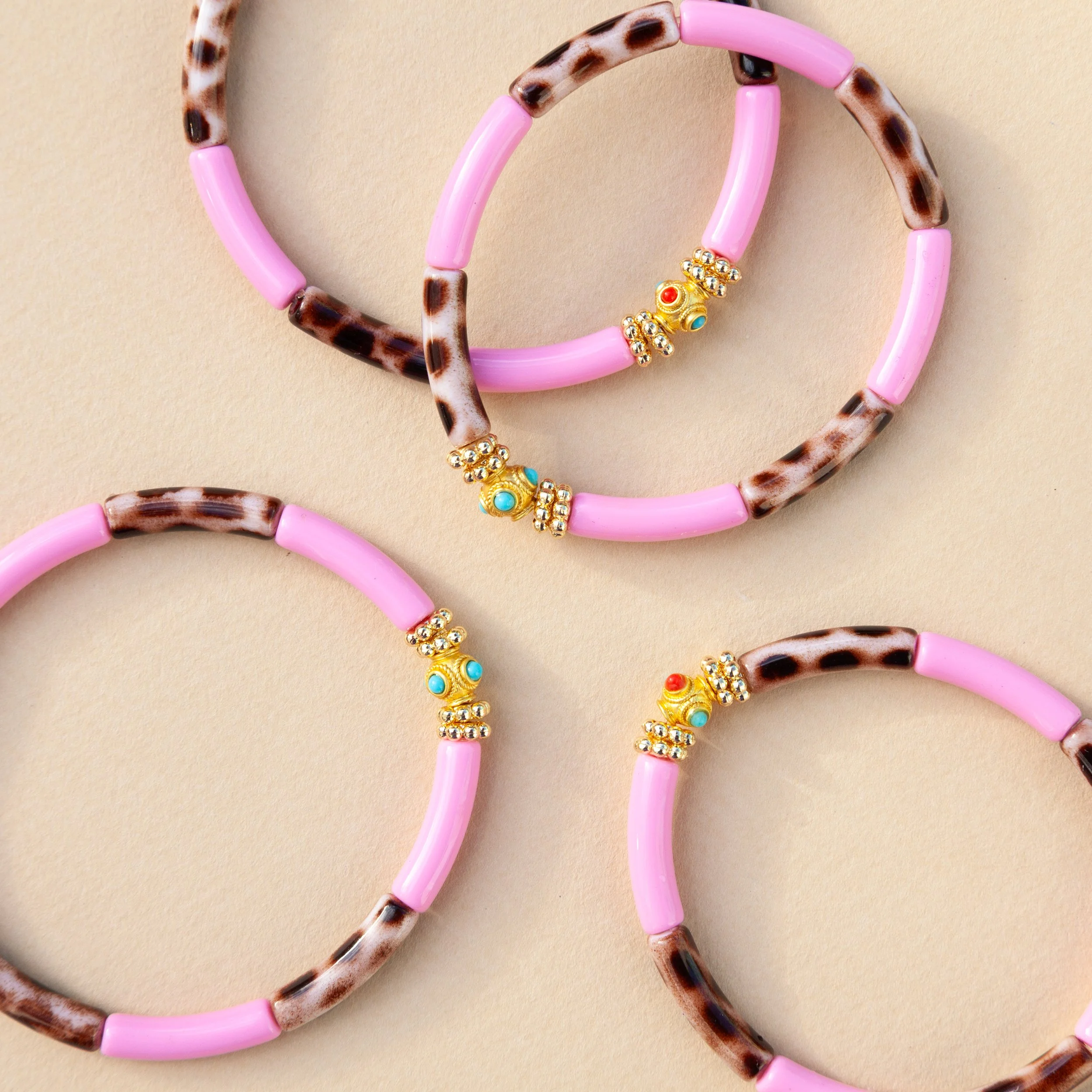 D’inspiration ethnique les Duo mini Leo, sont conçus pour être portés par paires. Chaque pièce est ornée de perles imprimées de motifs léopard, apportant une touche audacieuse et contemporaine à votre poignet.